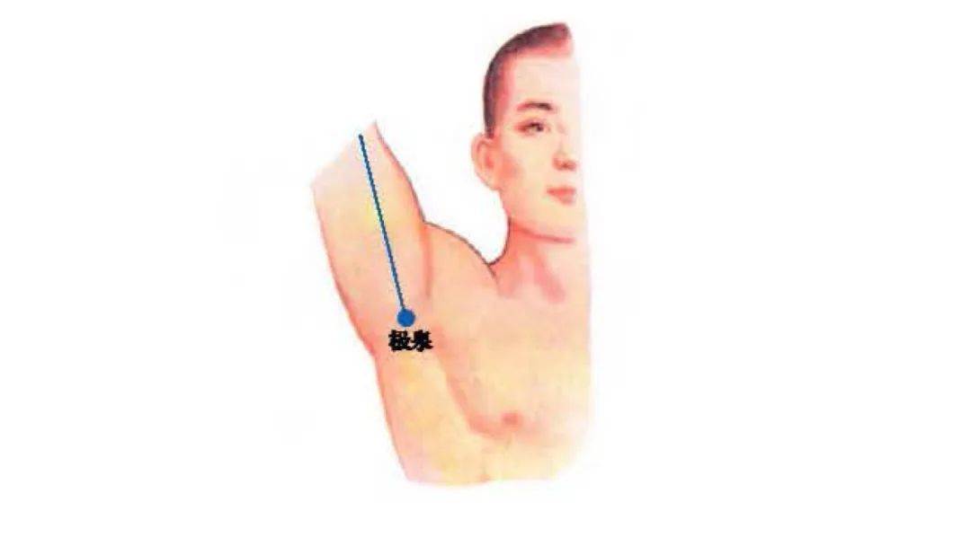 極泉穴位于腋窩頂點,腋動脈搏動處(腋窩最深處)。
